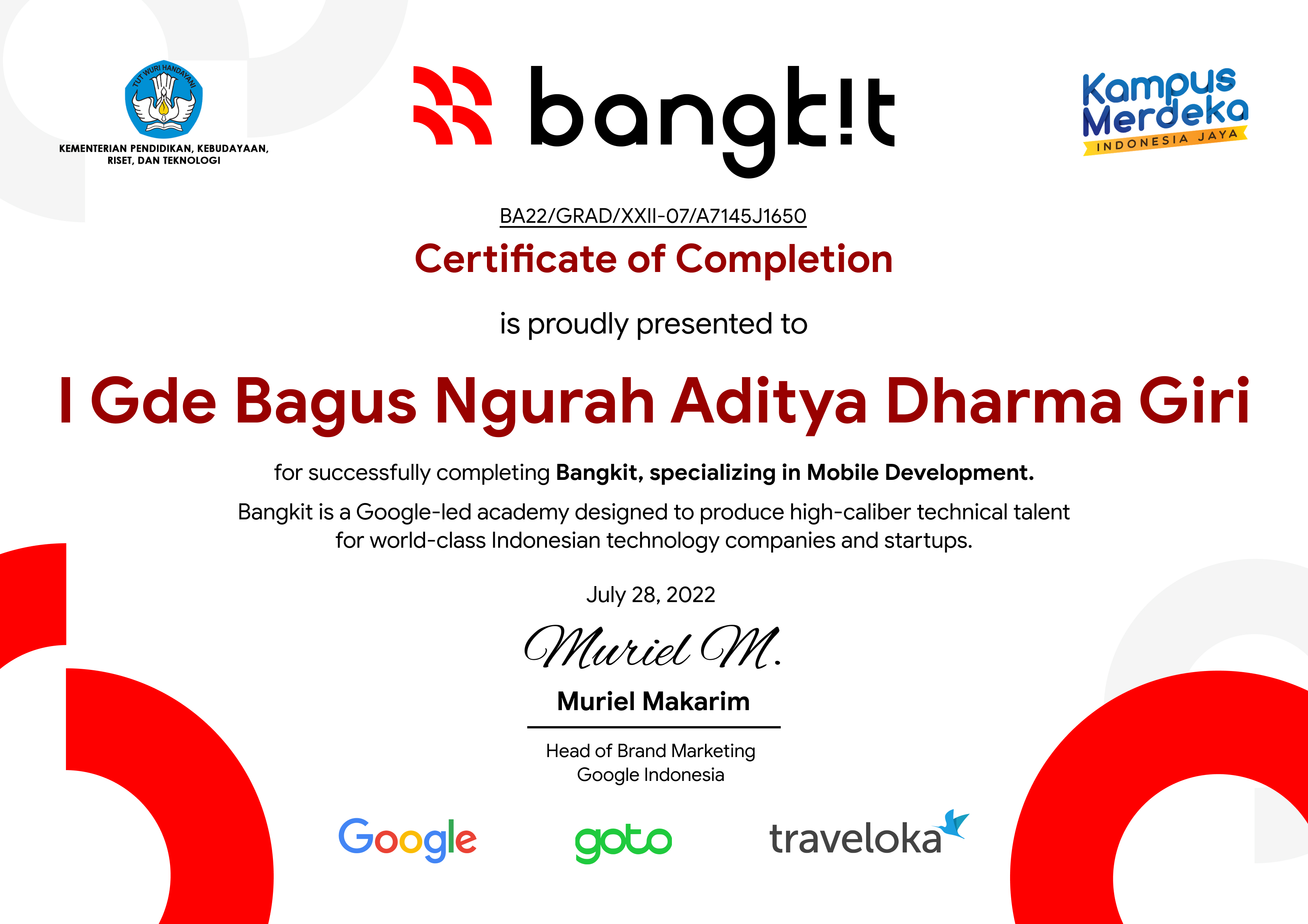 Hello, I'm I Gde Bagus Ngurah Aditya Dharma Giri. i learned about web developer and android developer kotlin. I learned android kotlin from coding during MBKM learning from Bangkit 2022 with learning from there and other learning from coding I am grateful that my experience with programming is getting faster, it has an impact on me seeing and learning other programming languages such as PHP on laravel where the way I understand is getting better good. my skill is laravel web and also android kotlin. now i'm interested in react js where i'm learning how to code, it's still early js where i'm starting to be able to easily learn react in the future.