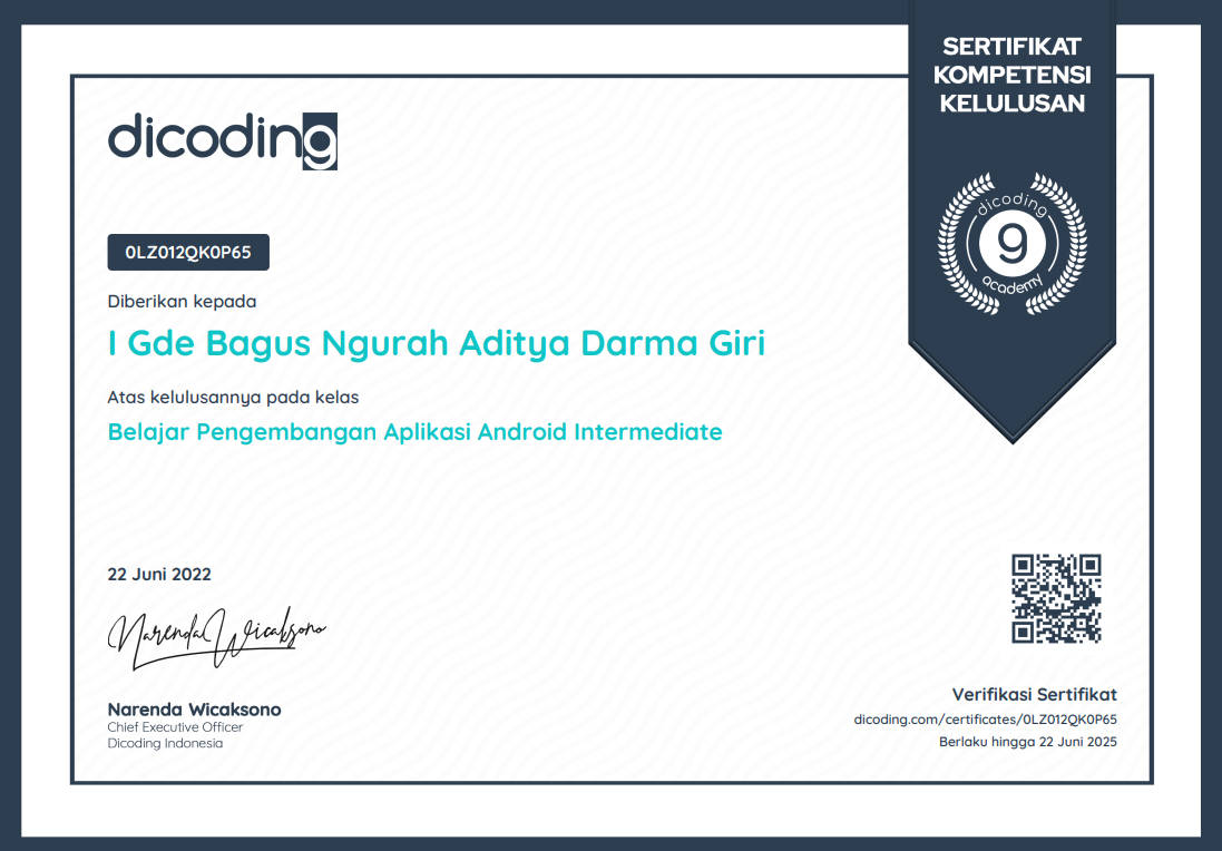 Hello, I'm I Gde Bagus Ngurah Aditya Dharma Giri. i learned about web developer and android developer kotlin. I learned android kotlin from coding during MBKM learning from Bangkit 2022 with learning from there and other learning from coding I am grateful that my experience with programming is getting faster, it has an impact on me seeing and learning other programming languages such as PHP on laravel where the way I understand is getting better good. my skill is laravel web and also android kotlin. now i'm interested in react js where i'm learning how to code, it's still early js where i'm starting to be able to easily learn react in the future.